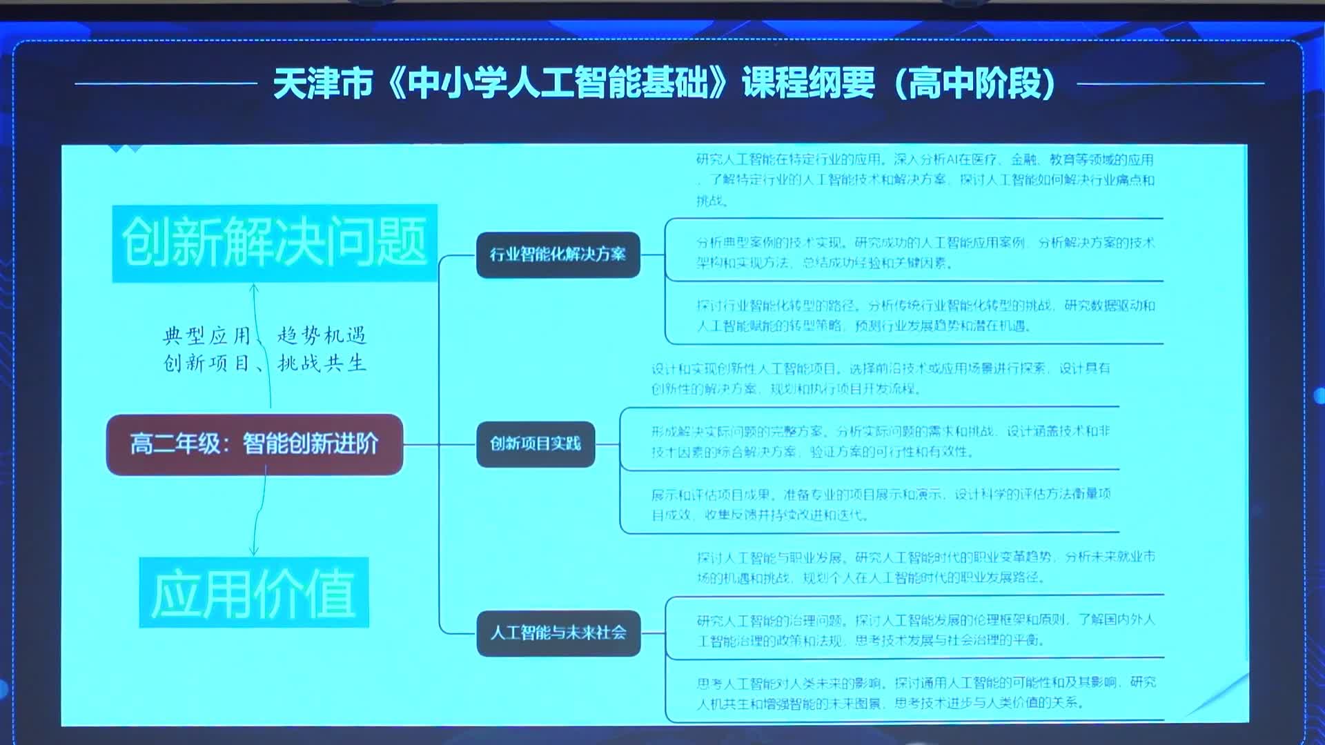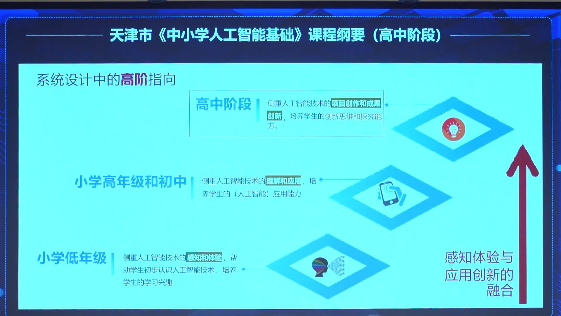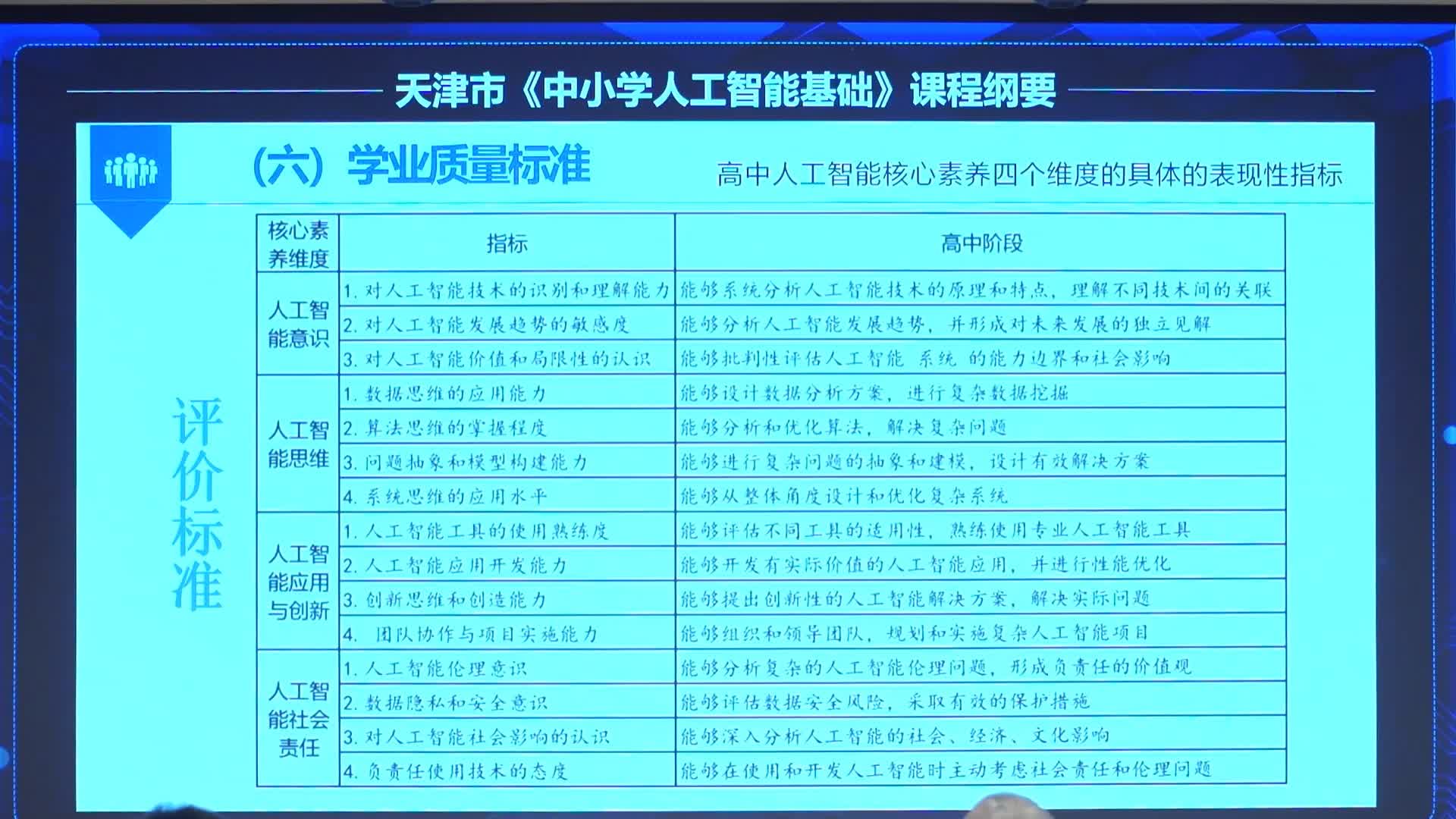 基于此我们就来汇报一下,我们天津市刚刚出台了天津市中小学人工智能基础的课程纲要。这个课程纲要也是