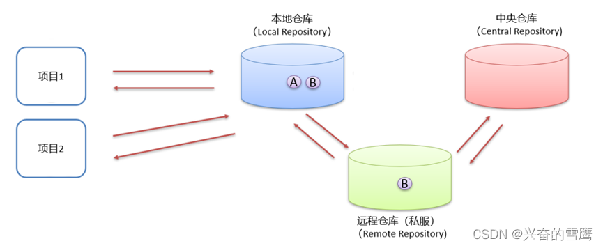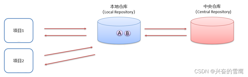 项目1需要A,先去本地仓库找,没有再去中央仓库找然后把A下载在本地仓库,最后从本地仓库给到项目1