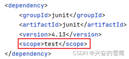如下图所示给 junit 依赖通过 scope 标签指定依赖的作用范围。 那么这个依赖就只能作用在测试环境,其他环境下不能使用。