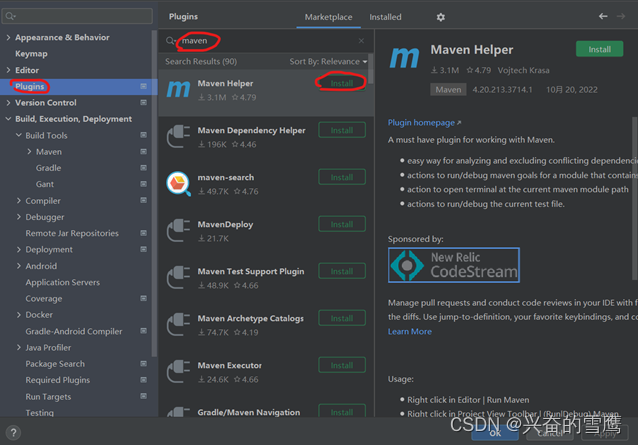 选择 IDEA中 File --> Settings,选择 Plugins,搜索 Maven,选择第一个 Maven Helper,点击Install安装,弹出面板中点击Accept,重启 IDEA。