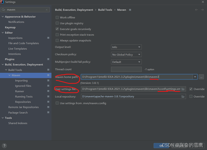 选择 IDEA中 File --> Settings,然后搜索 maven,更改这两个路径。
