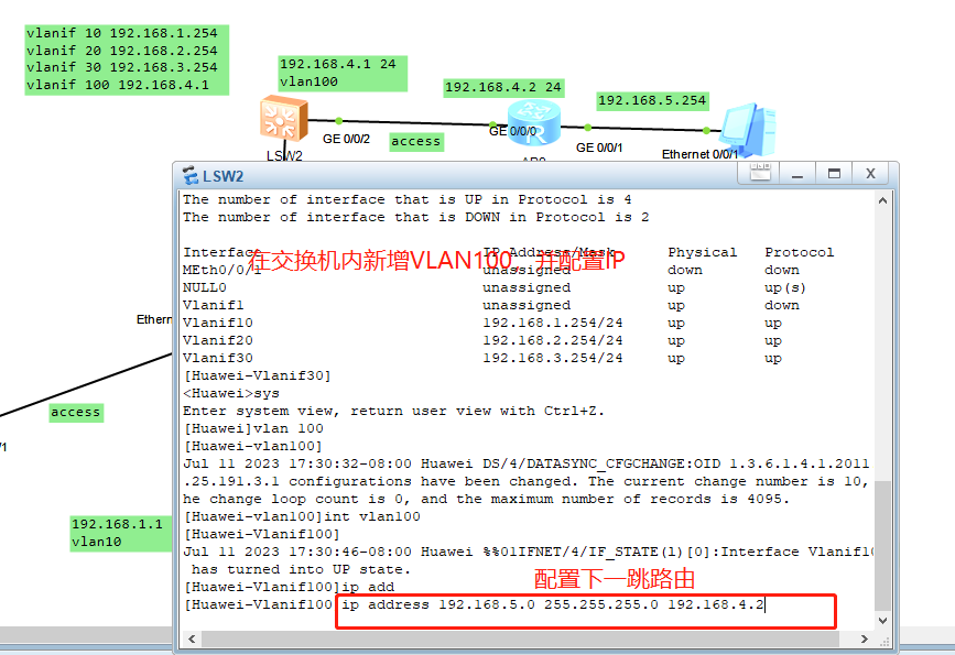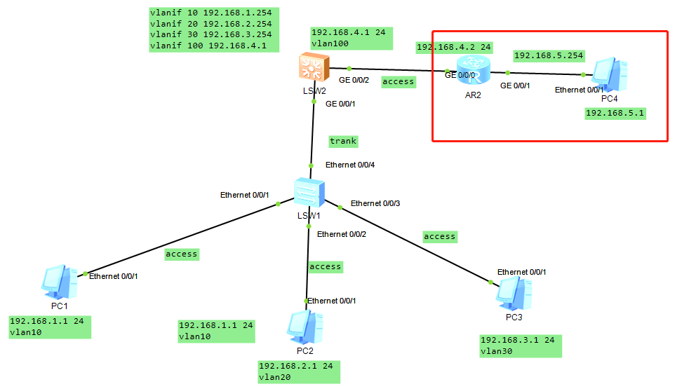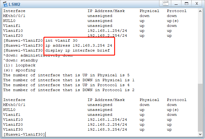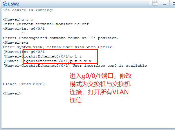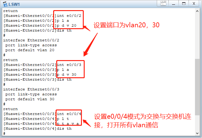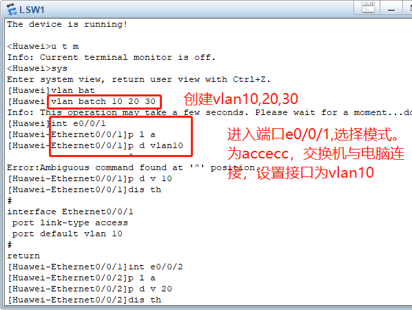 2.进入交换机 LSW1,给端口e0/0/1,e0/0/2,e0/0/3,设置好VLAN10,LAN20,LAN30,注意连接模式为access,端口是e开头的