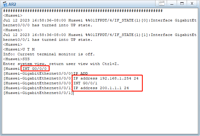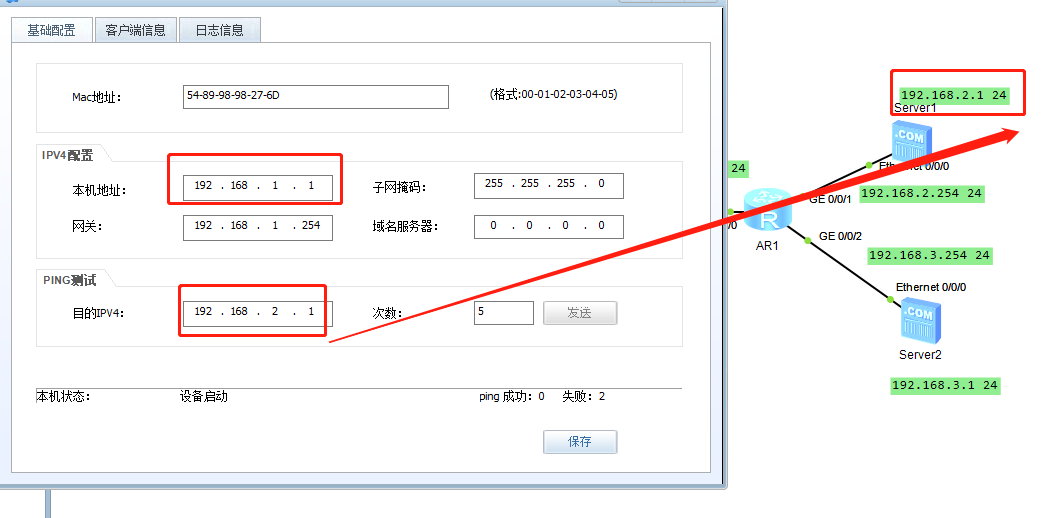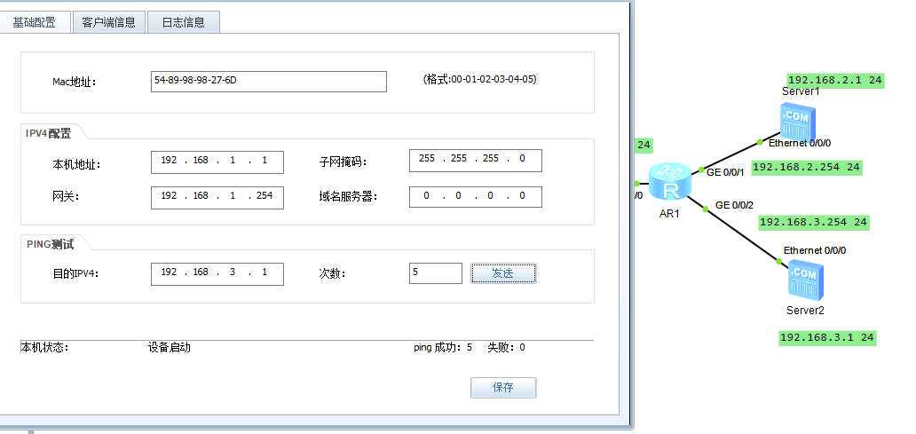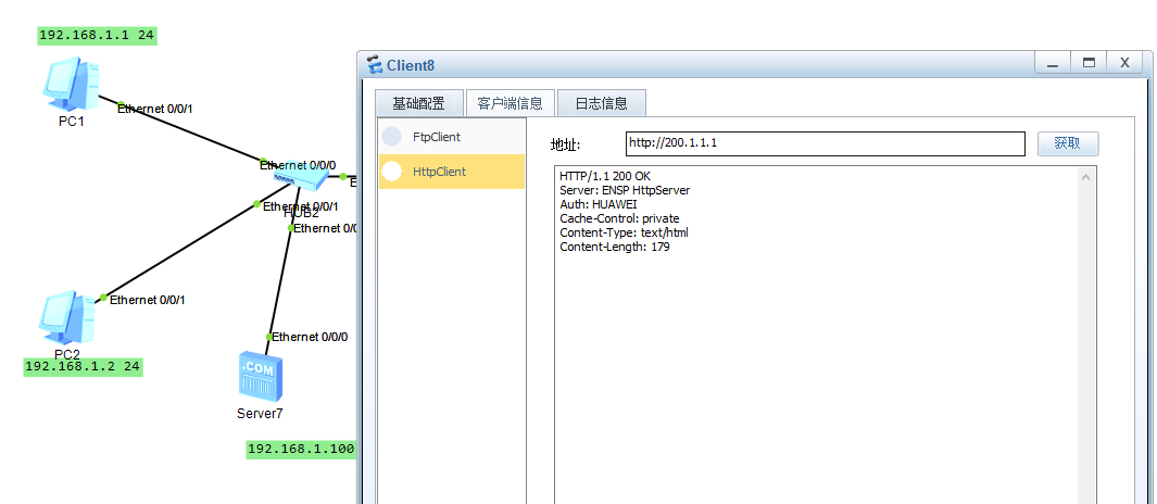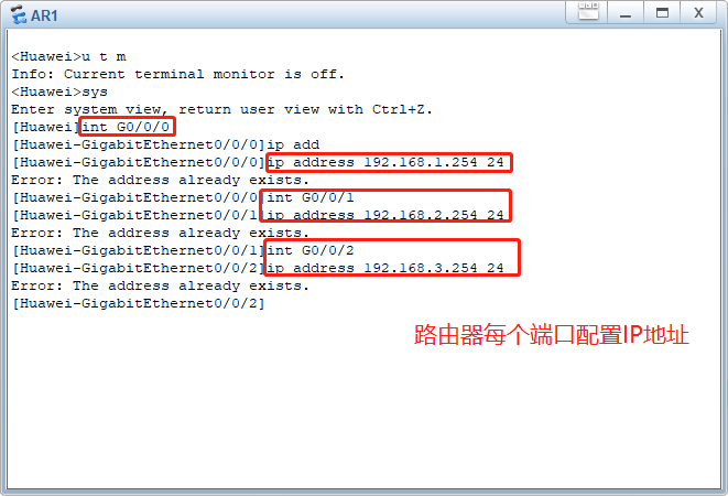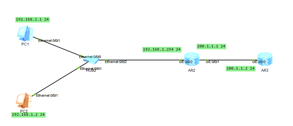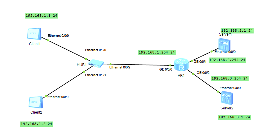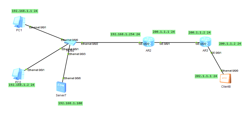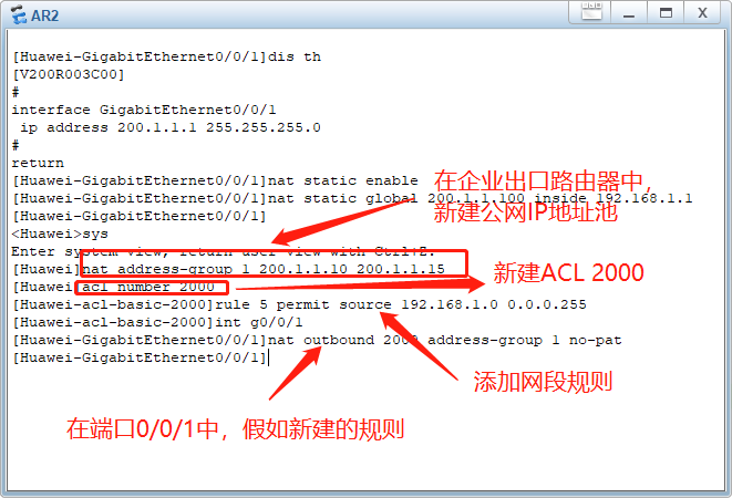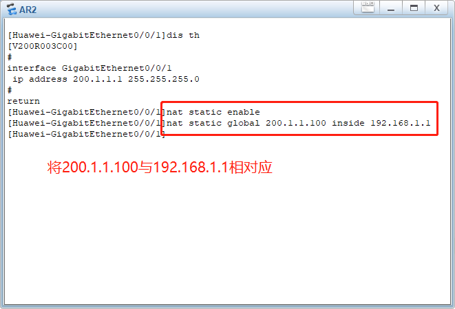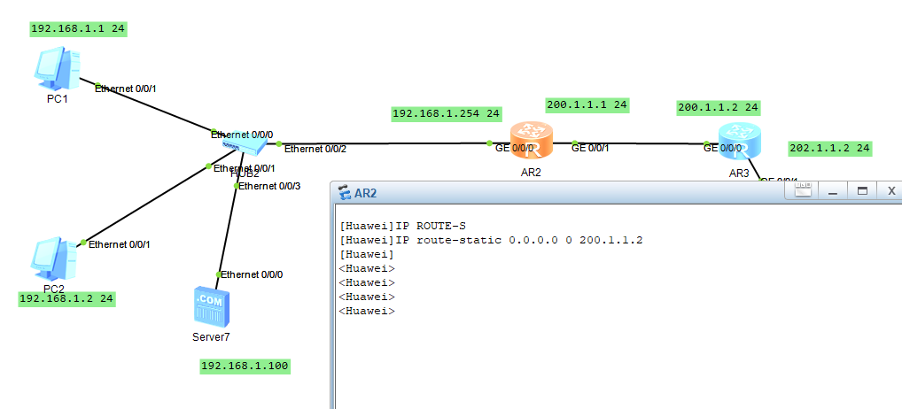 配置好所有机器的IP地址,在AR2中新增下一跳地址,就可以从企业出口路由器中映射企业服务器,在企业出口路由器中查看服务器。