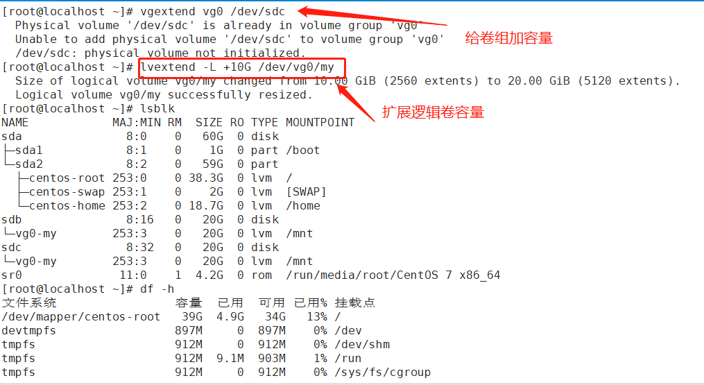 首先判断卷组的容量有没有用完,没有用完就继续分逻辑卷,要是用完了需要再次扩容卷组,加物理卷。