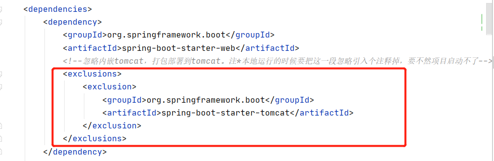 - pom.xml中需要排除掉Spring Boot内置的tomcat