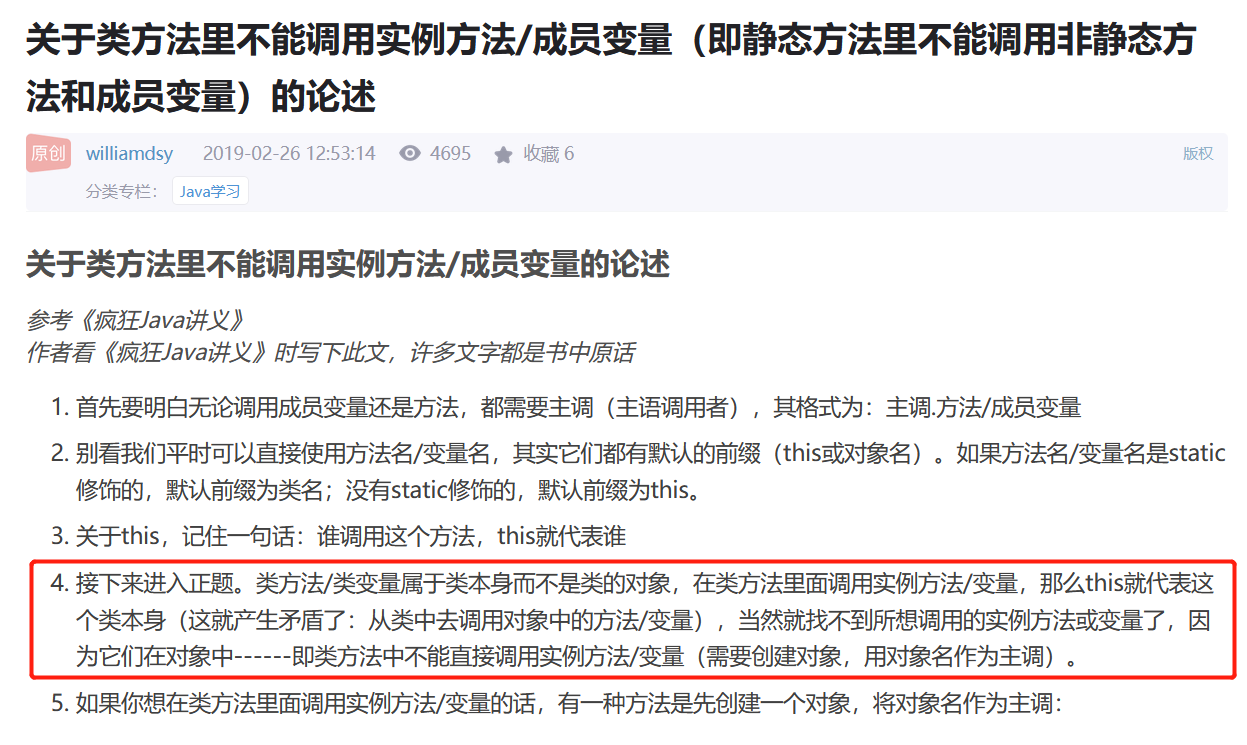 关于类方法里不能调用实例方法/成员变量(即静态方法里不能调用非静态方法和成员变量)的论述
