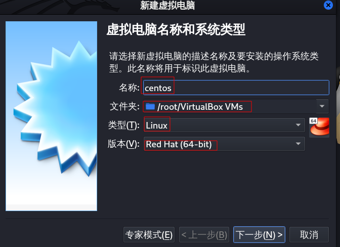 在virtualbox中点击新建。需要命名虚拟机名称,选择虚拟机文件保存位置,类型选择Linux,版本选择redhat64。