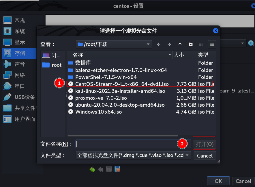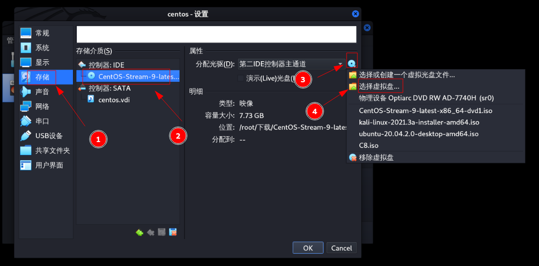 在存储一页选择挂载刚刚下载的centos镜像路径。