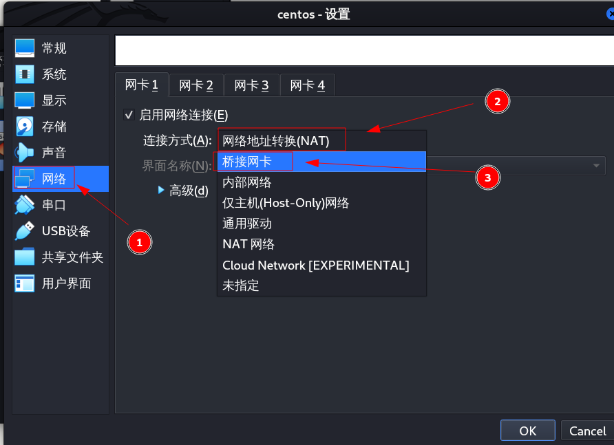 在网络一页选择,桥接网络模式。