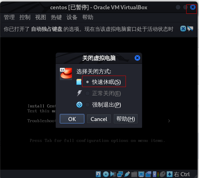 如想关闭虚拟机,点击右上角x号即可。选择“快速休眠”,虚拟机将进入休眠模式,相当于暂停,下次打开时将从暂停状态继续工作。选择“正常关闭”则类似于关机,下次打开时虚拟机将从开机开始运行。