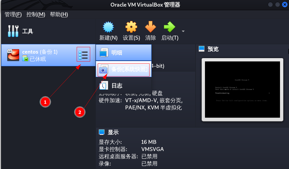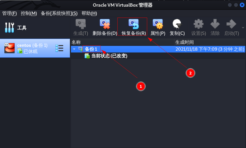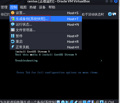在虚拟机运行过程中,点击控制–>生成备份可以生成系统快照