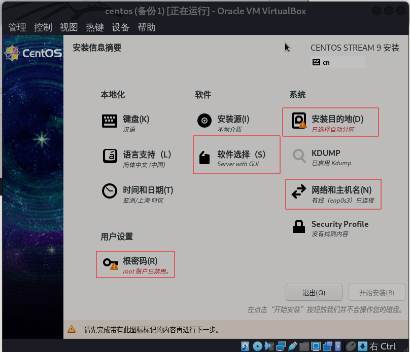 有安装目的地、软件选择、网络和主机名、根密码四项需要设置