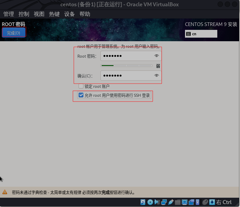 设置密码,勾选允许root用户ssh登录。点击完成。