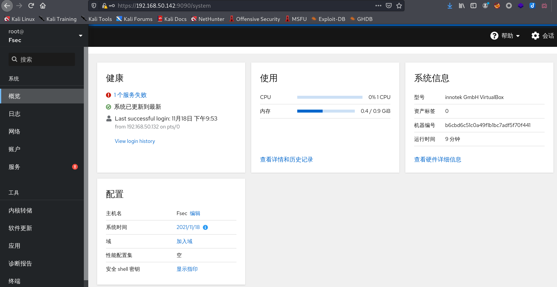 执行systemctl start cockpit命令开启cockpit。开启后可在浏览器输入虚拟机IP:9090端口访问系统
