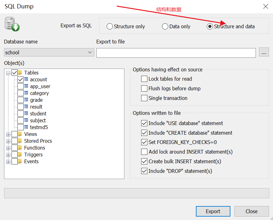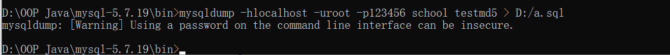 mysqldump -hlocalhost -uroot -p123456 school testmd5 > D:/a.sql