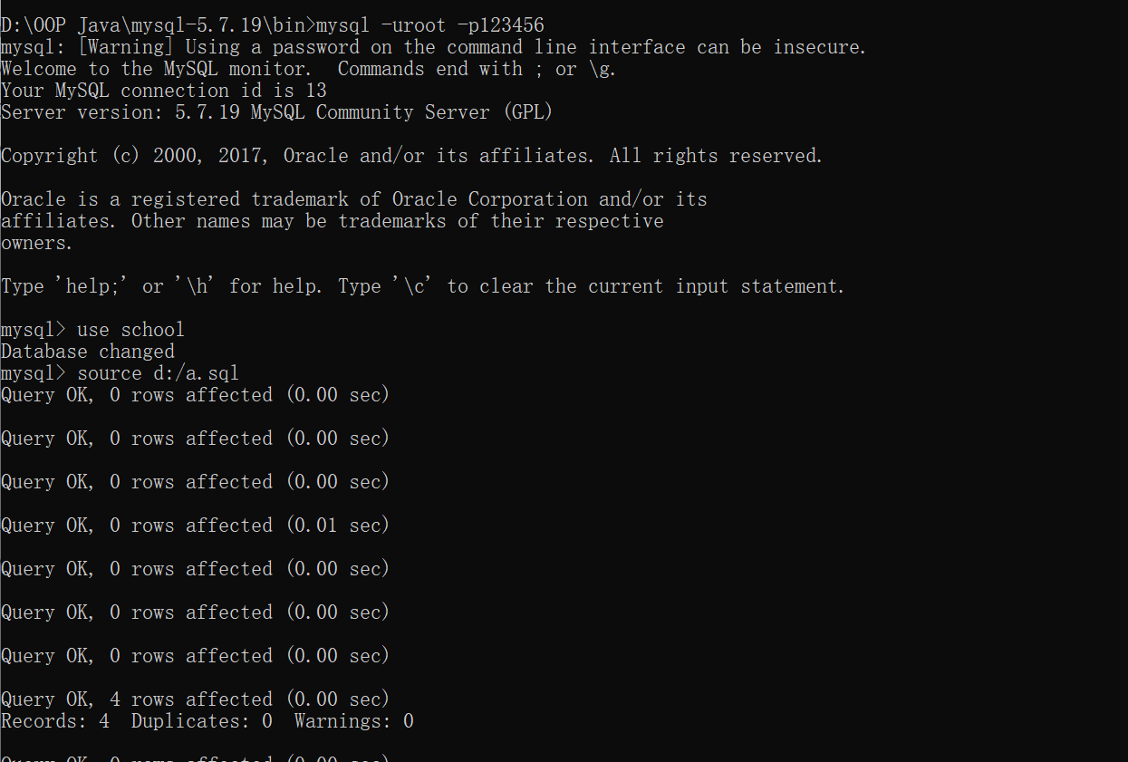 mysql -uroot -p123456 school < d:/a.sql # 另一种写法