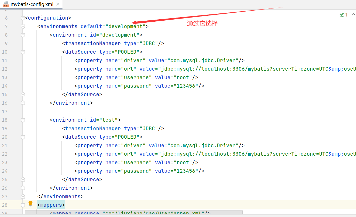 <!--环境environments 在内配置多套环境 default指定默认环境-->