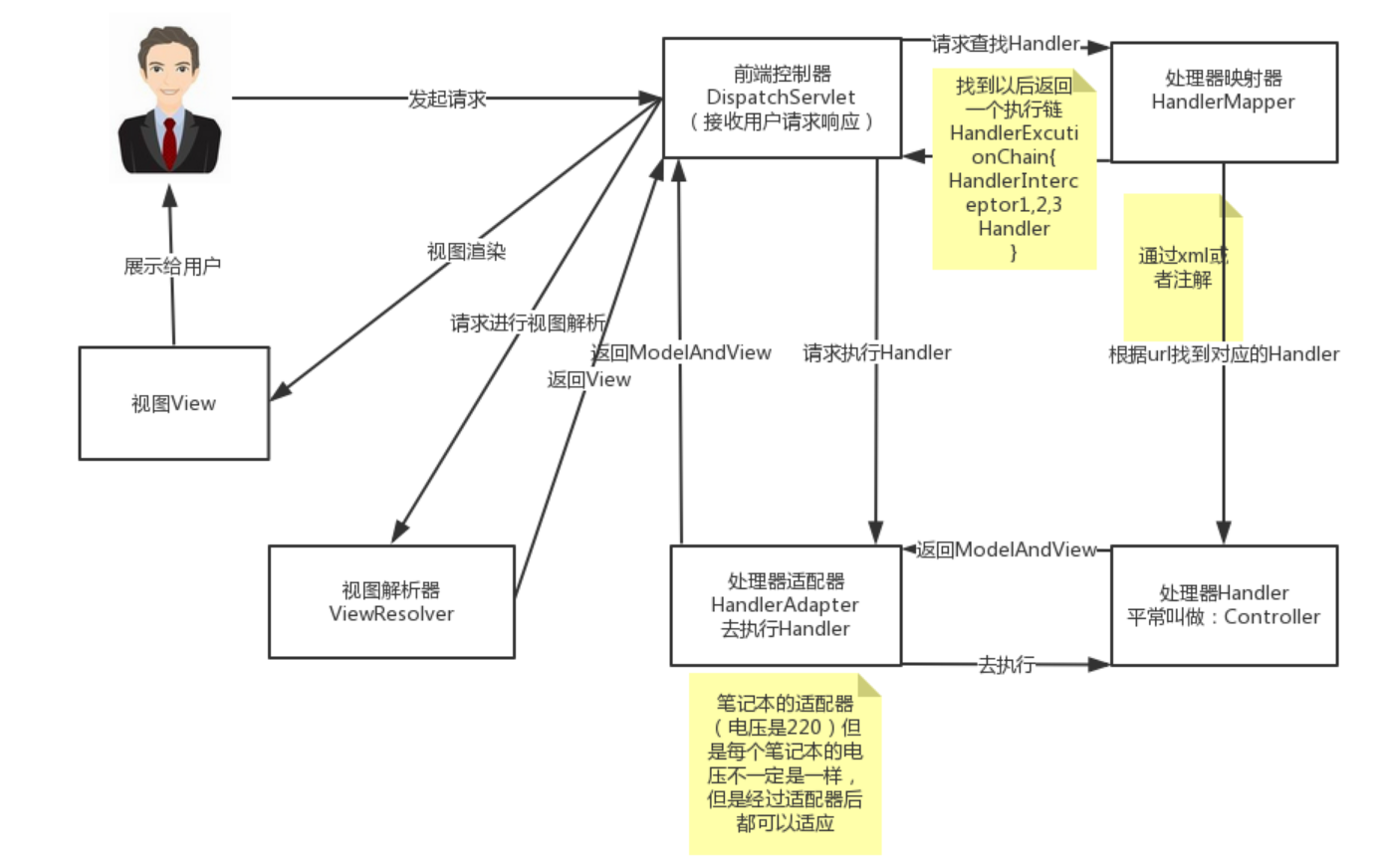 - Controller将具体的执行信息返回给HandlerAdapter,如ModelAndView。