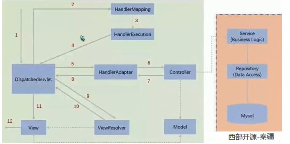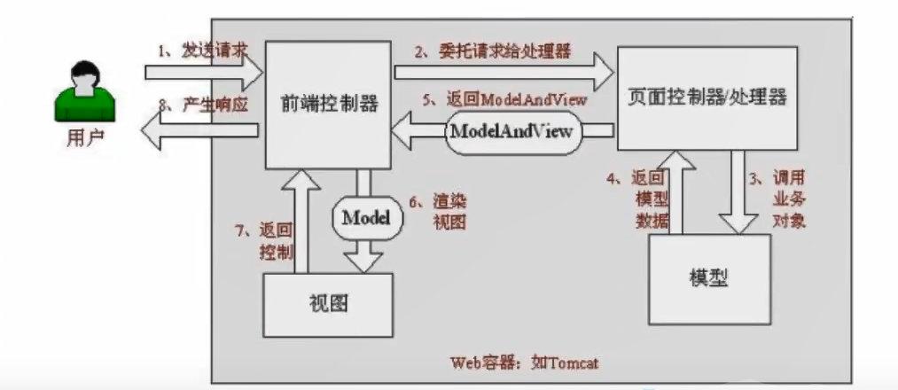 当发起请求时被前置的控制器拦截到请求,根据请求参数生成代理请求,找到请求对应的实际控制器,控制器处理请求,创建数据模型,访问数据库,将模型响应给中心控制器,控制器使用模型与视图渲染视图结果,将结果返回给中心控制器,再将结果返回给请求者。
