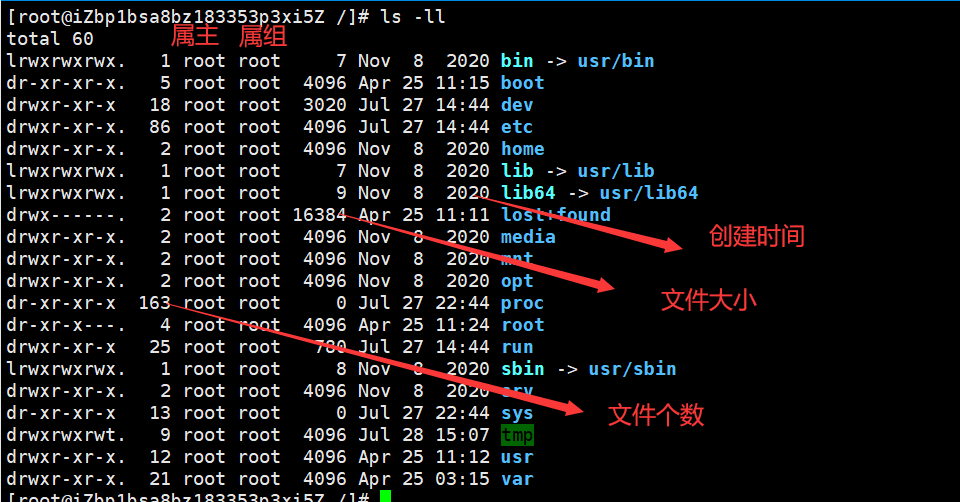 ls -l #参数列出所有的文件,包含文件的属性和权限,没有隐藏文件