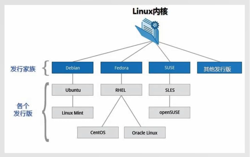 - 目前市面上较知名的发行版有:Ubuntu、RedHat、CentOS、Debian、Fedora、SuSE、OpenSUSE.