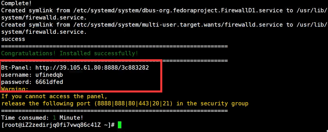 下载完毕之后,就可以得到一个地址:宝塔的管理面板,以及随机的用户名密码