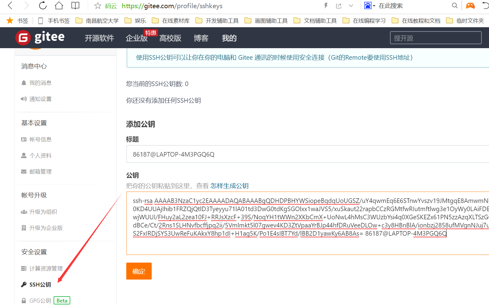 - 将公钥public key添加到码云