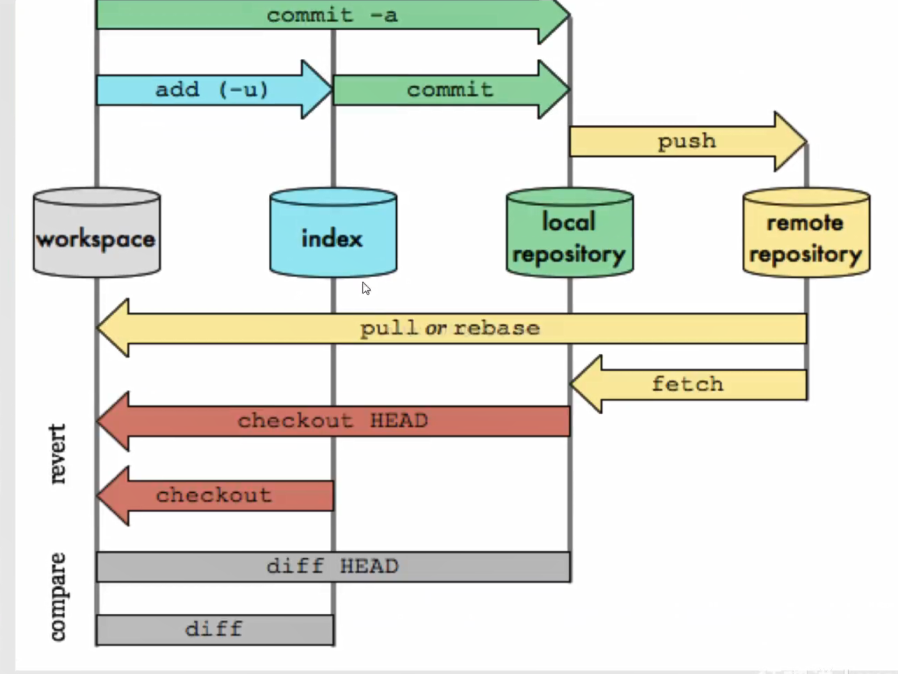- Index/Stage:暂存区,用于临时存放你的改动,事实上它只是一个文件,保存即将提交到文件列表信息