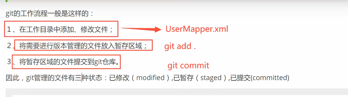 因此,git 管理的文件有三种状态︰已修改( modified ),已暂存( staged ),已提交(committed)。
