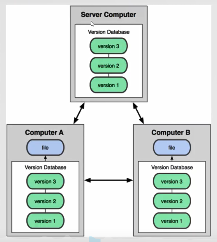 所有版本信息仓库全部同步到本地的每个用户,这样就可以在本地查看所有版本历史,可以离线在本地提交,只需在连网时push到相应的服务器或其他用户那里。由于每个用户那里保存的都是所有的版本数据,只要有一个用户的设备没有问题就可以恢复所有的数据,但这增加了本地存储空间的占用。