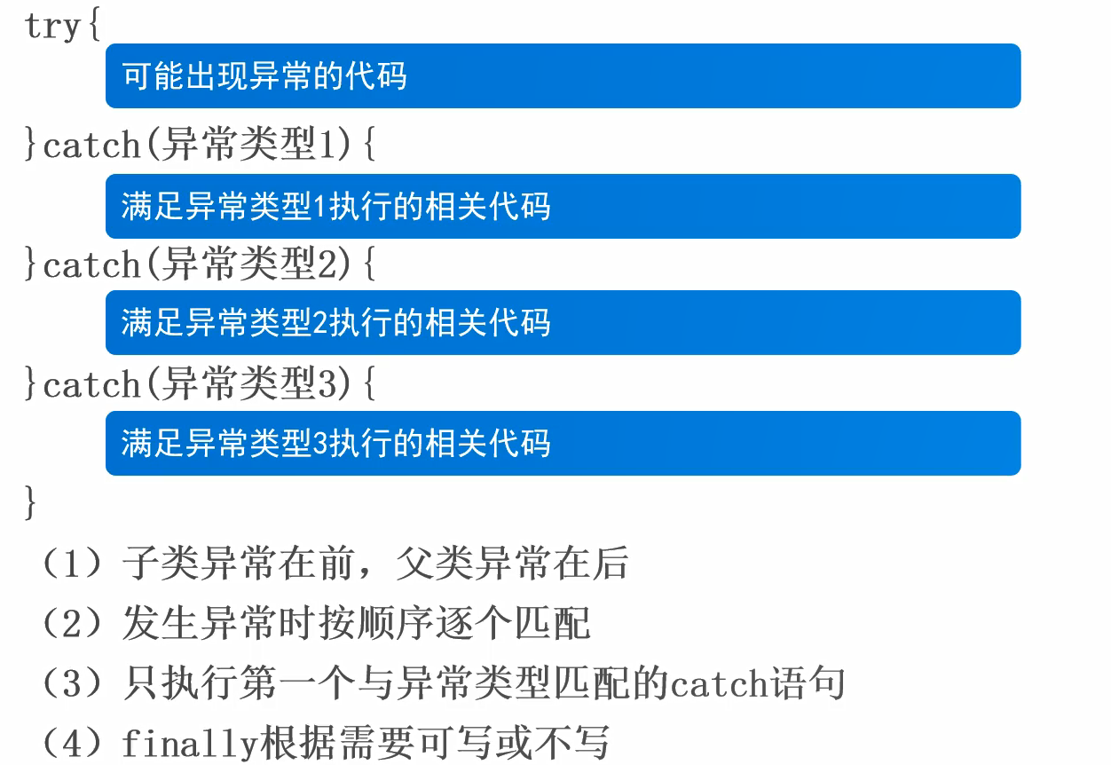 - 使用原则:底层代码向上声明或者抛出异常,最上层一定要处理异常,否则程序中断。