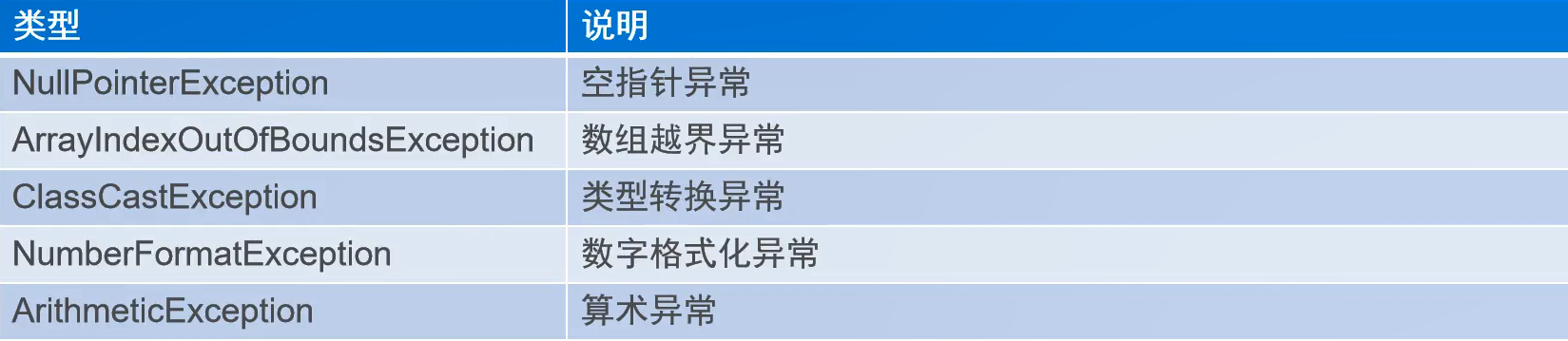 - 概念:程序在运行过程中出现的不正常现象。出现异常不处理将终止程序运行。