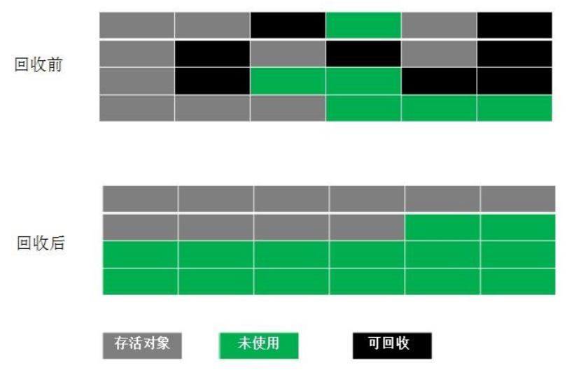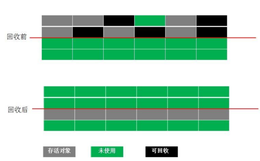 从图中我们就可以发现,该算法最大的问题是内存碎片化严重,后续可能发生大对象不能找到可利用空间的问题。