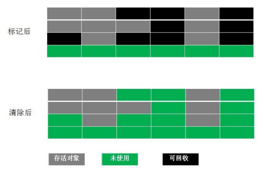 最基础的垃圾回收算法,分为两个阶段,标注和清除。标记阶段标记出所有需要回收的对象,清除阶段回收被标记的对象所占用的空间。如图:
