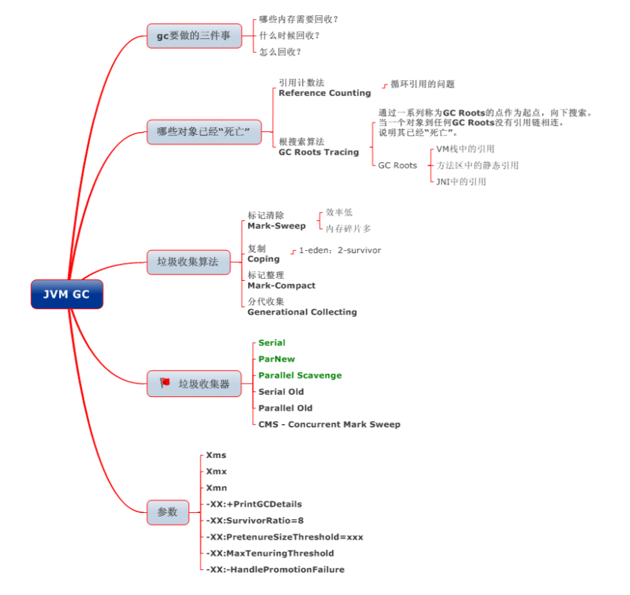 为了解决引用计数法的循环引用问题,Java 使用了可达性分析的方法。通过一系列的 GC roots 对象作为起点搜索。如果在 GC roots 和一个对象之间没有可达路径,则称该对象是不可达的。要注意的是,不可达对象不等价于可回收对象,不可达对象变为可回收对象至少要经过两次标记过程。两次标记后仍然是可回收对象,则将面临回收。