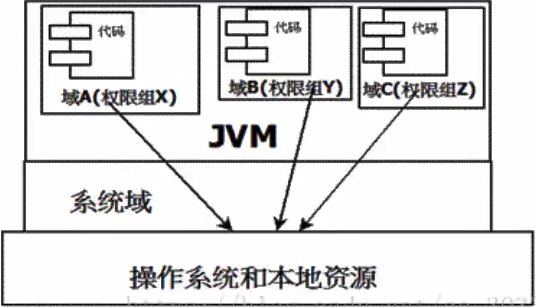 当前最新的安全机制实现,则引入了域(Domain)的概念。虚拟机会把所有代码加载到不同的系统域和应用域,系统域部分专门负责与关键资源进行交互,而各个应用域部分则通过系统域的部分代理来对各种需要的资源进行访问。虚拟机中不同的受保护域(Protected Domain),对应不一样的权限(Permission)。存在于不同域中的类文件就具有了当前域的全部权限,如下图所示最新的安全模型(jdk 1.6):