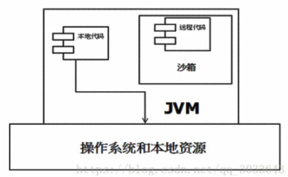 在 Java 中将执行程序分成本地代码和远程代码两种,本地代码默认视为可信任的,而远程代码则被看作是不受信的。对于授信的本地代码,可以访问一切本地资源。而对于非授信的远程代码在早期的 Java 实现中,安全依赖于沙箱(Sandbox)机制。如下图所示 JDK1.0 安全模型: