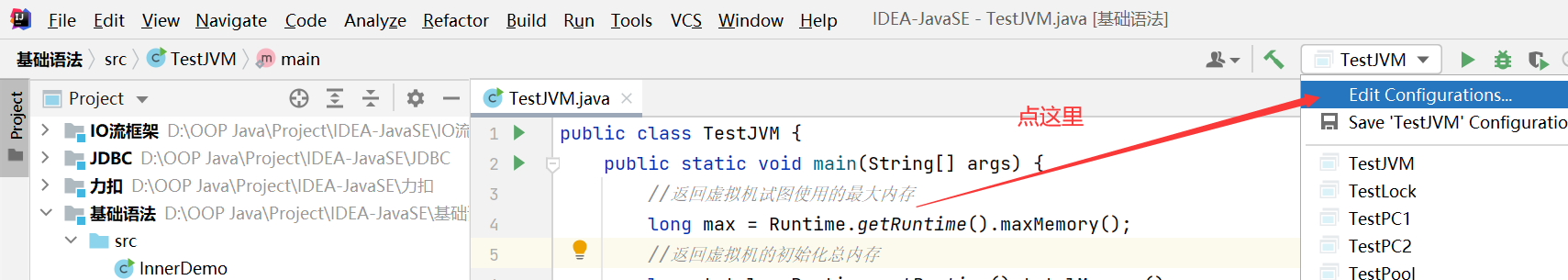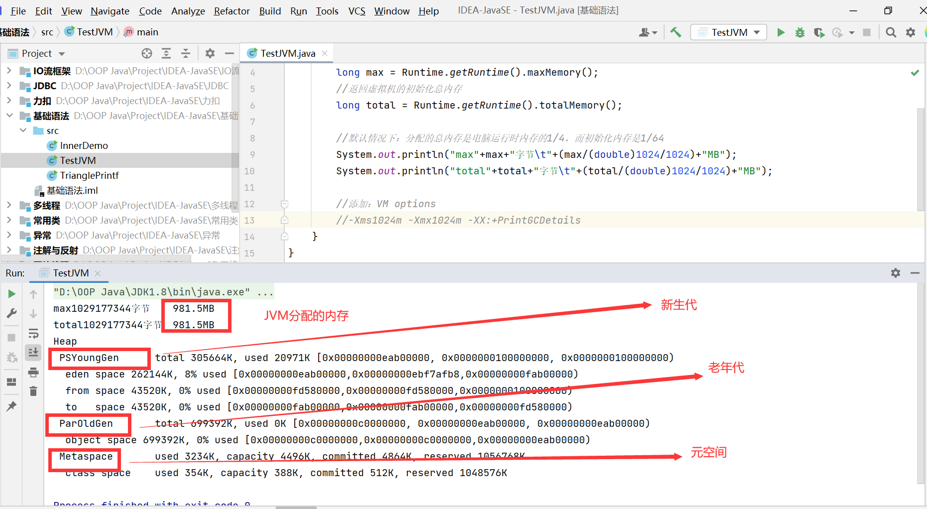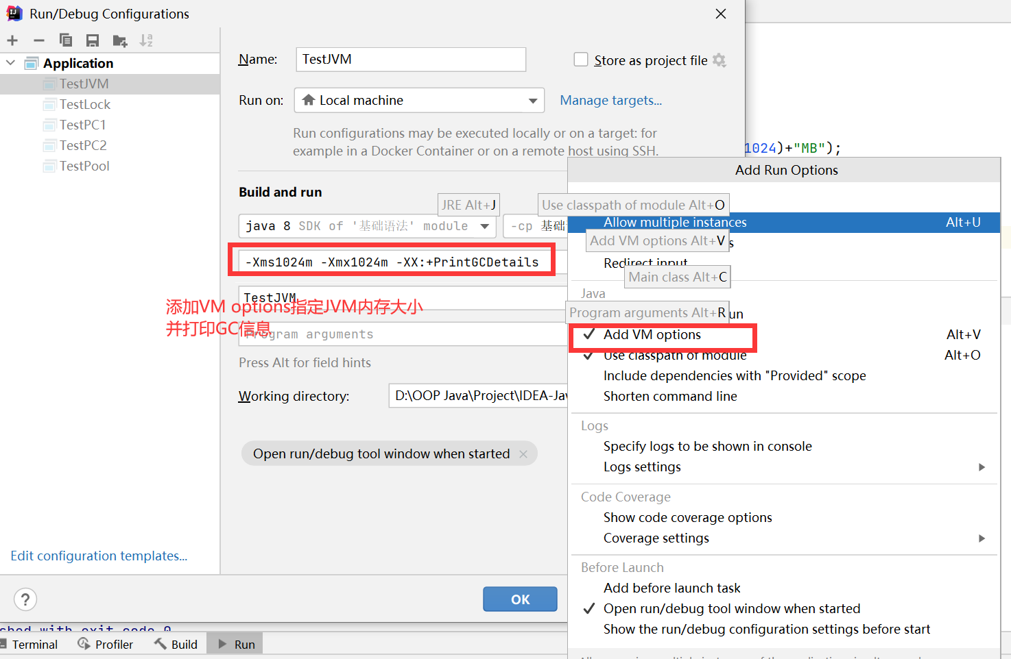 如下图添加 VM options:-Xms1024m -Xmx1024 -XX:+PrintGCDetails,再次执行程序: