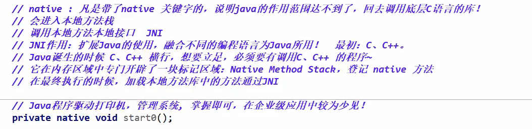 本地方法区和 Java Stack 作用类似,区别是虚拟机栈为执行 Java 方法服务,而本地方法栈则为Native方法服务, 如果一个 VM 实现使用 C-linkage 模型来支持 Native 调用,那么该栈将会是一个 C 栈,但 HotSpot VM 直接就把本地方法栈和虚拟机栈合二为一。