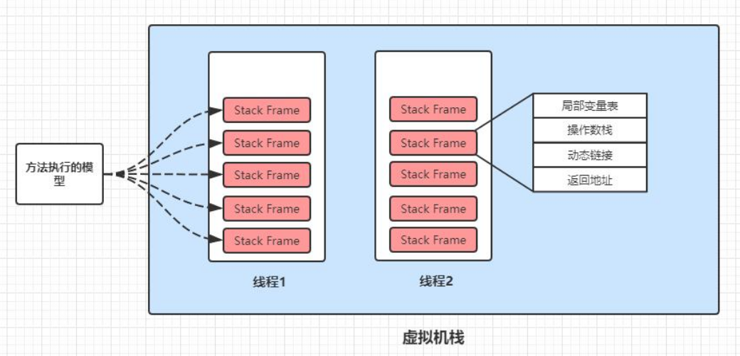 是描述 java 方法执行的内存模型,每个方法在执行的同时都会创建一个栈帧(Stack Frame)用于存储局部变量表、操作数栈、动态链接、方法出口等信息。每一个方法从调用直至执行完成的过程,就对应着一个栈帧在虚拟机栈中入栈到出栈的过程。