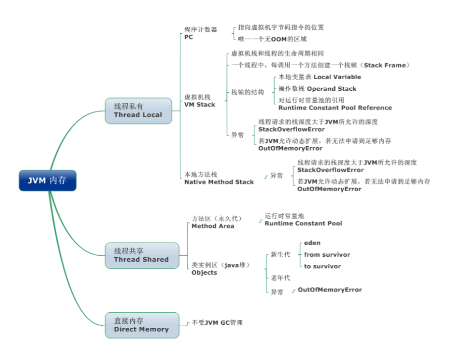 JVM 内存区域主要分为线程私有区域【程序计数器、虚拟机栈、本地方法区】、线程共享区域【JAVA 堆、方法区】、直接内存。