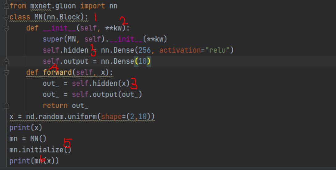 mn实例化。6 mn() 会调用 继承自 nn.block的__call__函数,函数中调用4 forward()。