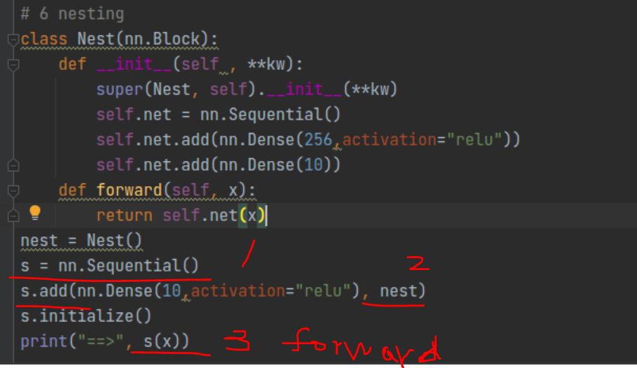 3 调用call时走到sequential的类,forward函数,是遍历有序字典_children,其中这个_children 在实例化nest时候已经存入了sequential的self._children,当外部二次实例化sequential的实例时,这个_children也传了进去。相当于操作的是同一个_children对象。