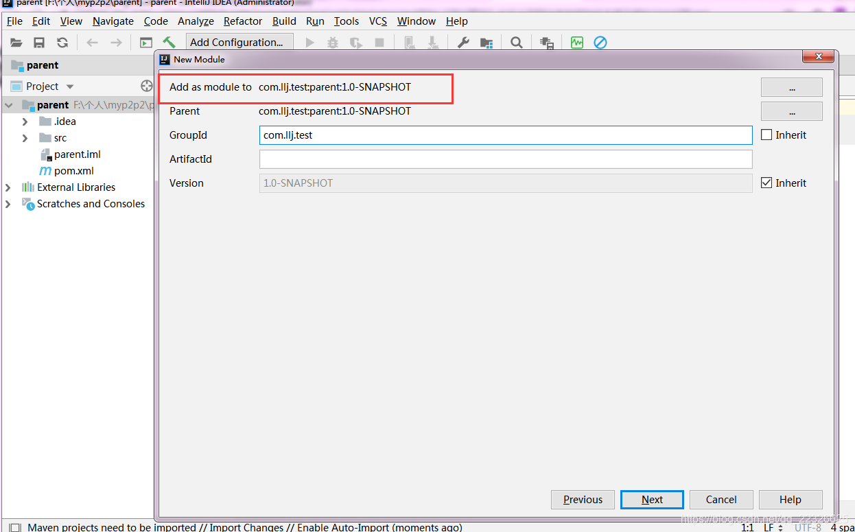 在继承关系的项目中添加模块时,父pom会被覆盖,且添加的模块内容直接附加在项目目录下,这不是预想的结果:
