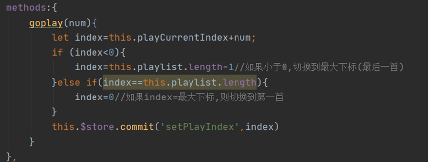Let index=this.playCurrentIndex+num,index就会获取当前播放歌曲下标playCurrentIndex上一首(-1)或下一首(+1)的下标,使用commit将index的值传到setPlayIndex函数中来修改当前播放音乐下标.