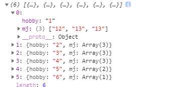 var huaji = [{ name: 'a', hobby: '1', mj: '12' }, { name: 'a', hobby: '2', mj: '13' }, { name: 'a', hobby: '3', mj: '14' }, { name: 'a', hobby: '4', mj: '15' }, { name: 'a', hobby: '5', mj: '162' }, { name: 'a', hobby: '6', mj: '15' }, { name: 'q', hobby: '1', mj: '13' }, { name: 'q', hobby: '2', mj: '16' }, { name: 'q', hobby: '3', mj: '17' }, { name: 'q', hobby: '4', mj: '19' }, { name: 'q', hobby: '5', mj: '16' }, { name: 'x', hobby: '1', mj: '13' }, { name: 'x', hobby: '2', mj: '13' }, { name: 'x', hobby: '3', mj: '16' }, { name: 'x', hobby: '4', mj: '17' }] let tempArr = []; var newArr = []; for (let i = 0; i < huaji.length; i++) { if (tempArr.indexOf(huaji[i].hobby) === -1) { newArr.push({ hobby: huaji[i].hobby, mj: [huaji[i].mj] }); tempArr.push(huaji[i].hobby); } else { for (let j = 0; j < newArr.length; j++) { if (newArr[j].hobby == huaji[i].hobby) { newArr[j].mj.push(huaji[i].mj); break; } } } } console.log(newArr);