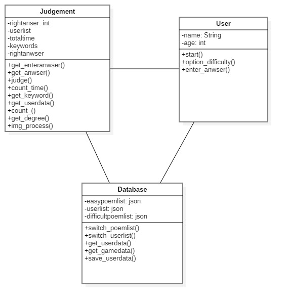 3、数据库:属性包括简单诗词列表、复杂诗词列表和用户信息列表;方法包括转换诗词信息、转换用户信息,获取用户游戏信息、获取用户游戏信息和储存用户信息列表