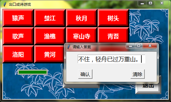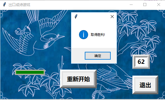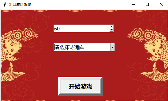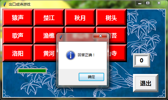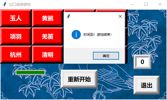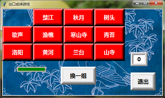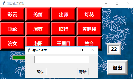 1 # -*- coding: UTF-8 -*- 2 # Author: Lu Yao and Li Xiaohua 3 4 import json 5 import random 6 import time 7 import tkinter as tk 8 import tkinter.ttk as ttk 9 import tkinter.messagebox 10 from PIL import Image, ImageTk 11 12 13 def open_db(json_file): 14 text = open(json_file, "r", encoding="utf-8") 15 poetry_dict = json.load(text) 16 text.close() 17 return poetry_dict 18 19 20 def process_img(jpg_file): 21 source_img = Image.open(jpg_file) 22 real_img = ImageTk.PhotoImage(source_img) 23 return real_img 24 25 26 def countdown(seconds): 27 t = seconds * 100 + 100 28 time_lab = tk.Label(root, bg="white", fg="black", font=("微软雅黑", 14, "bold"), width=3, height=1, 29 relief="ridge", borderwidth=10) 30 time_lab.place(x=440, y=150) 31 for s in range(t, -1, -1): 32 try: 33 time_lab["text"] = s // 100 34 root.update() 35 time.sleep(0.01) 36 except tk.TclError: 37 break 38 if s == 0: 39 tk.messagebox.showinfo(message="时间到!游戏结束!") 40 41 42 def show_btns(): 43 btn_1.place(x=0, y=0, width=105, height=60) 44 btn_2.place(x=105, y=0, width=105, height=60) 45 btn_3.place(x=210, y=0, width=105, height=60) 46 btn_4.place(x=315, y=0, width=105, height=60) 47 btn_5.place(x=0, y=60, width=105, height=60) 48 btn_6.place(x=105, y=60, width=105, height=60) 49 btn_7.place(x=210, y=60, width=105, height=60) 50 btn_8.place(x=315, y=60, width=105, height=60) 51 btn_9.place(x=0, y=120, width=105, height=60) 52 btn_10.place(x=105, y=120, width=105, height=60) 53 btn_11.place(x=210, y=120, width=105, height=60) 54 btn_12.place(x=315, y=120, width=105, height=60) 55 56 57 def set_game(): 58 global set_bg 59 enter_btn.place_forget() 60 start_bg.pack_forget() 61 set_bg.pack() 62 set_time.place(x=175, y=50) 63 choose_db.place(x=175, y=110) 64 start_btn.place(x=190, y=220) 65 66 67 def identify_db(): 68 global db_file 69 if db.get() == "诗词库": 70 db_file = "poetry_database.json" 71 return db_file 72 73 74 def random_sel(): 75 global ans_1, ans_2, ans_3, ans_4, ans_5, ans_6, ans_7, ans_8, ans_9, ans_10, ans_11, ans_12 76 record = [] 77 seconds = eval(set_time.get()) 78 json_file = identify_db() 79 poetry_dict = open_db(json_file) 80 set_time.place_forget() 81 choose_db.place_forget() 82 start_btn.place_forget() 83 set_bg.pack_forget() 84 change_btn.place(x=200, y=200) 85 quit_btn.place(x=440, y=220) 86 time_left.place(x=50, y=200) 87 play_bg.pack() 88 show_btns() 89 for i in range(100): 90 loc = random.randint(1, 100) 91 if loc not in record: 92 record.append(loc) 93 line_count = poetry_dict[loc - 1]["line"] 94 line_num = random.randint(1, line_count) 95 if len(record) == 1: 96 kwd_1.set(poetry_dict[loc - 1]["keyword"][line_num - 1]) 97 ans_1 = poetry_dict[loc - 1]["text"][line_num - 1] 98 elif len(record) == 2: 99 kwd_2.set(poetry_dict[loc - 1]["keyword"][line_num - 1]) 100 ans_2 = poetry_dict[loc - 1]["text"][line_num - 1] 101 elif len(record) == 3: 102 kwd_3.set(poetry_dict[loc - 1]["keyword"][line_num - 1]) 103 ans_3 = poetry_dict[loc - 1]["text"][line_num - 1] 104 elif len(record) == 4: 105 kwd_4.set(poetry_dict[loc - 1]["keyword"][line_num - 1]) 106 ans_4 = poetry_dict[loc - 1]["text"][line_num - 1] 107 elif len(record) == 5: 108 kwd_5.set(poetry_dict[loc - 1]["keyword"][line_num - 1]) 109 ans_5 = poetry_dict[loc - 1]["text"][line_num - 1] 110 elif len(record) == 6: 111 kwd_6.set(poetry_dict[loc - 1]["keyword"][line_num - 1]) 112 ans_6 = poetry_dict[loc - 1]["text"][line_num - 1] 113 elif len(record) == 7: 114 kwd_7.set(poetry_dict[loc - 1]["keyword"][line_num - 1]) 115 ans_7 = poetry_dict[loc - 1]["text"][line_num - 1] 116 elif len(record) == 8: 117 kwd_8.set(poetry_dict[loc - 1]["keyword"][line_num - 1]) 118 ans_8 = poetry_dict[loc - 1]["text"][line_num - 1] 119 elif len(record) == 9: 120 kwd_9.set(poetry_dict[loc - 1]["keyword"][line_num - 1]) 121 ans_9 = poetry_dict[loc - 1]["text"][line_num - 1] 122 elif len(record) == 10: 123 kwd_10.set(poetry_dict[loc - 1]["keyword"][line_num - 1]) 124 ans_10 = poetry_dict[loc - 1]["text"][line_num - 1] 125 elif len(record) == 11: 126 kwd_11.set(poetry_dict[loc - 1]["keyword"][line_num - 1]) 127 ans_11 = poetry_dict[loc - 1]["text"][line_num - 1] 128 elif len(record) == 12: 129 kwd_12.set(poetry_dict[loc - 1]["keyword"][line_num - 1]) 130 ans_12 = poetry_dict[loc - 1]["text"][line_num - 1] 131 countdown(seconds) 132 break 133 if loc in record: 134 continue 135 136 137 def answer_qu(btn_x, ans_x): 138 global ans_entry 139 global ans_window 140 ans_window = tk.Toplevel() 141 window_width = root.winfo_screenwidth() 142 window_height = root.winfo_screenheight() 143 w = int((window_width - 300) / 2) 144 h = int((window_height - 100) / 2) 145 ans_window.geometry("300x100+%s+%s" % (w, h)) 146 ans_window.title("请输入答案") 147 ans_entry = tk.Entry(ans_window, font=("微软雅黑", 14)) 148 ans_entry.pack(pady=10) 149 confirm_btn = tk.Button(ans_window, text="确认", command=lambda: judge_ans(btn_x, ans_x), font=("微软雅黑", 12)) 150 confirm_btn.pack(anchor=tk.S, side=tk.LEFT, padx=40, pady=10) 151 clear_btn = tk.Button(ans_window, text="清除", command=clear_ans, font=("微软雅黑", 12)) 152 clear_btn.pack(anchor=tk.S, side=tk.RIGHT, padx=40, pady=10) 153 154 155 def judge_ans(btn_y, ans_y): 156 global right_count 157 if ans_entry.get() == ans_y: 158 tk.messagebox.showinfo(message="回答正确!") 159 ans_window.destroy() 160 btn_y.place_forget() 161 if right_count == 12: 162 change_btn["text"] = "重新开始" 163 tk.messagebox.showinfo(message="取得胜利!") 164 right_count = 0 165 else: 166 tk.messagebox.showerror(message="回答错误!") 167 168 169 def clear_ans(): 170 ans_entry.delete(0, tk.END) 171 172 173 def close_window(): 174 if tk.messagebox.askokcancel(message="您确定要退出吗?"): 175 root.destroy() 176 177 178 def quit_game(): 179 if tk.messagebox.askokcancel(message="您确定要退出吗?"): 180 root.destroy() 181 182 183 root = tk.Tk() 184 root.title("出口成诗游戏") 185 root.geometry("550x300") 186 187 right_count =