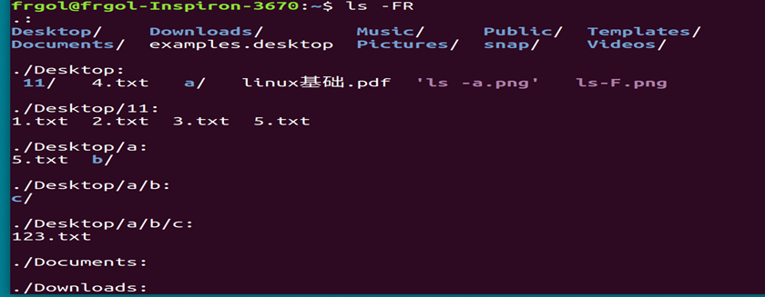 ls -R:递归选项,列出当前目录下包含的子目录中的文件(会显示很多文件)