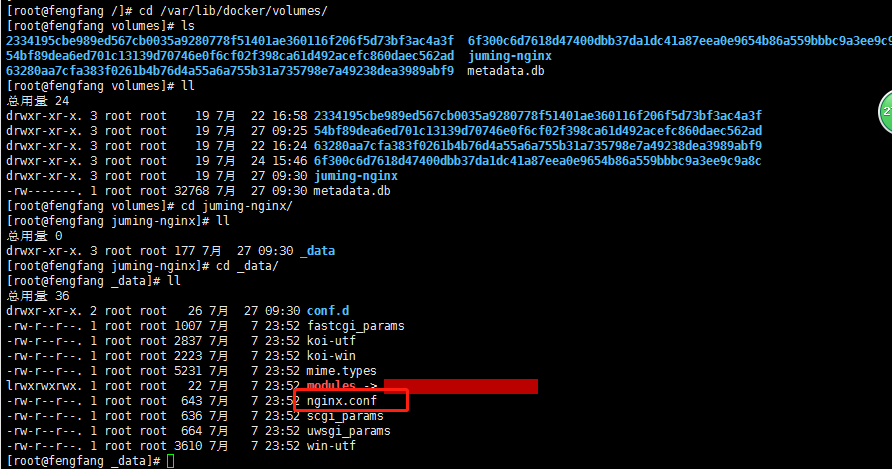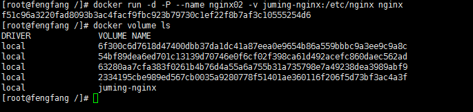 docker run -d -P --name nginx02 -v juming-nginx:/etc/nginx nginx #使用具名挂载启动nginx,再使用docker volume ls查看时,如下图这样